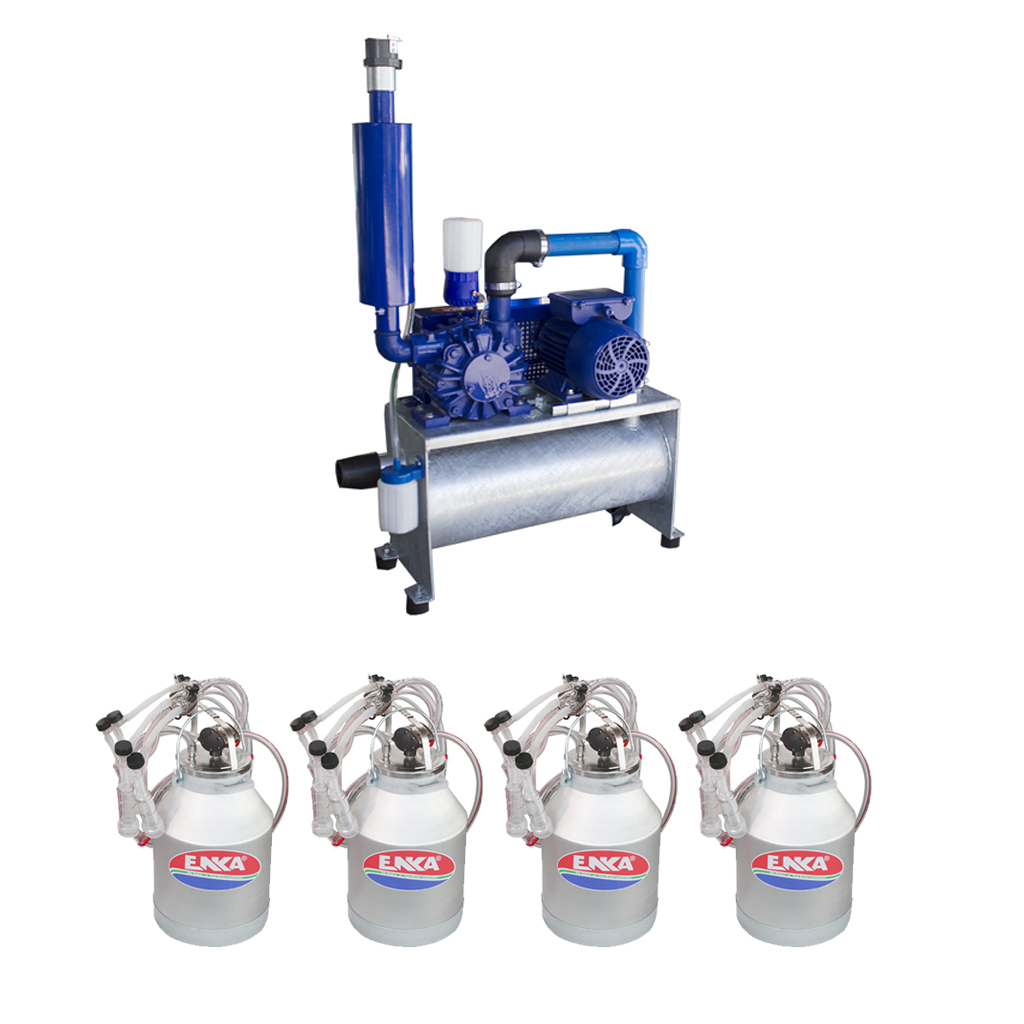 La bomba de vacío funciona con un motor eléctrico monofásico (220V 50Hz – 230V 50Hz) o con un motor eléctrico trifásico (380V 50Hz). (Debe especificarse al momento del pedido). Se realiza un ordeño saludable y rápido con pulsadores de alta calidad y duraderos. El tanque de vacío está galvanizado y en el sistema hay una bomba de aceite de larga duración.»