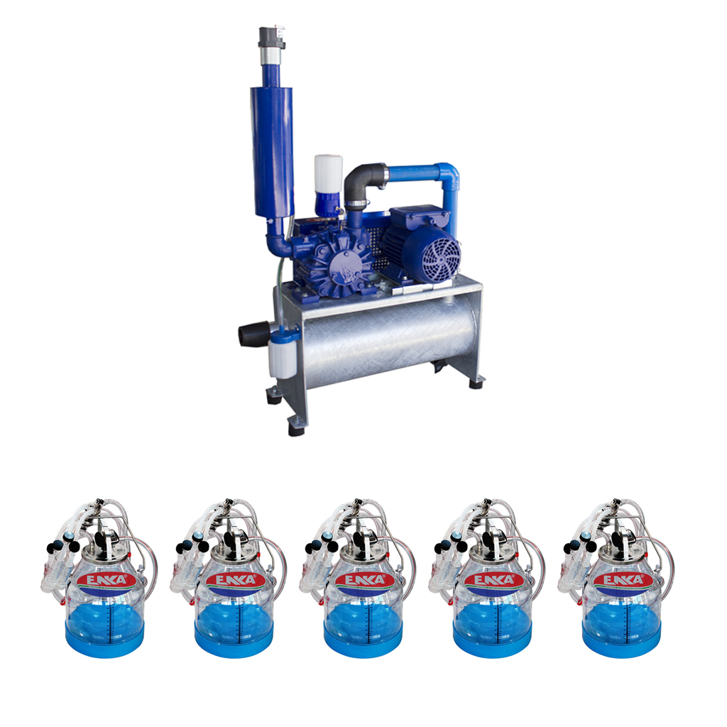 La bomba de vacío funciona con un motor eléctrico monofásico (220V 50Hz – 230V 50Hz) o con un motor eléctrico trifásico (380V 50Hz). (Debe especificarse al momento del pedido). Se realiza un ordeño saludable y rápido con pulsadores de alta calidad y duraderos. El tanque de vacío está galvanizado y en el sistema hay una bomba de aceite de larga duración.»