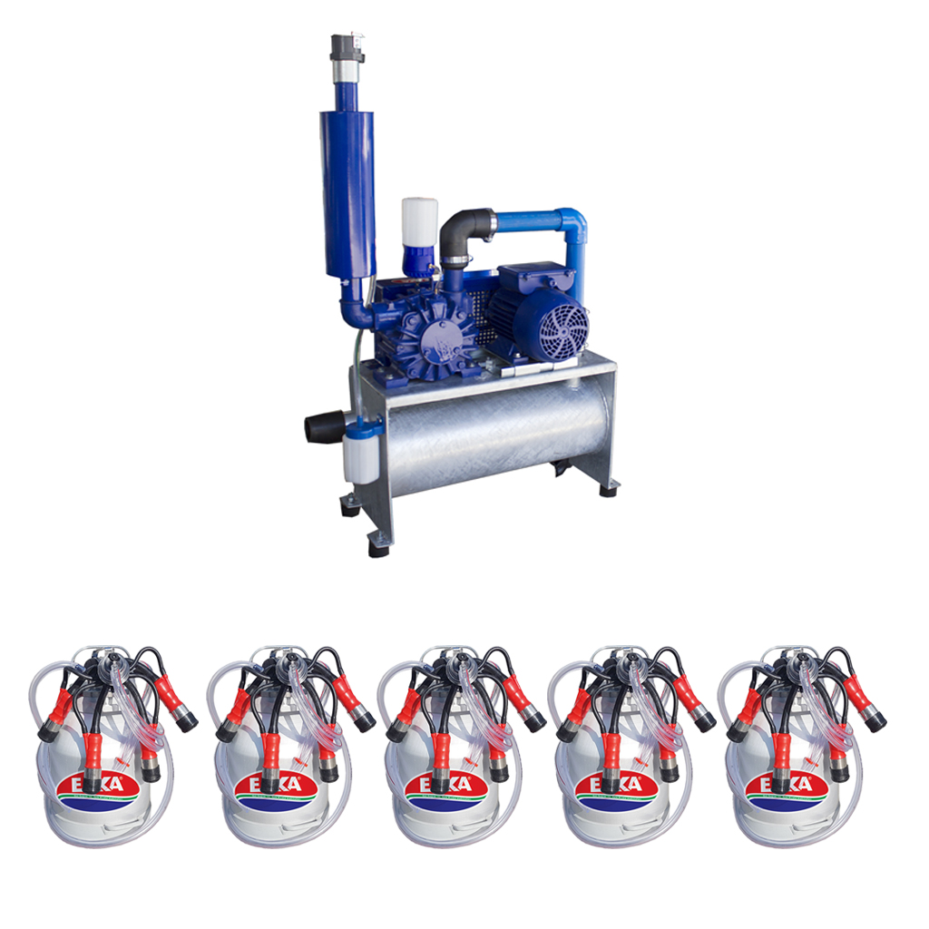 La bomba de vacío funciona con un motor eléctrico monofásico (220V 50Hz – 230V 50Hz) o con un motor eléctrico trifásico (380V 50Hz). (Debe especificarse al momento del pedido). Se realiza un ordeño saludable y rápido con pulsadores de alta calidad y duraderos. El tanque de vacío está galvanizado y en el sistema hay una bomba de aceite de larga duración.»